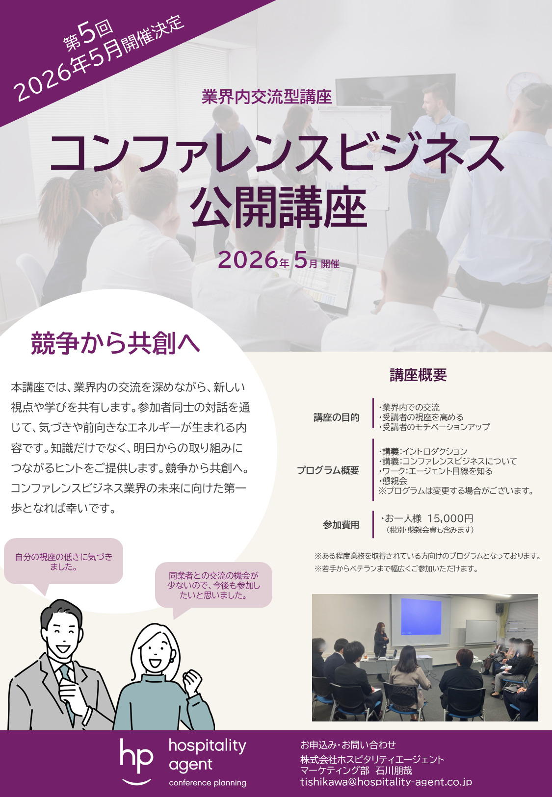 ホスピタリティエージェントでは、MICE・コンファレンス業界に従事する方向けに、実務で使える知識やモチベーション向上のための講座を実施しております。
